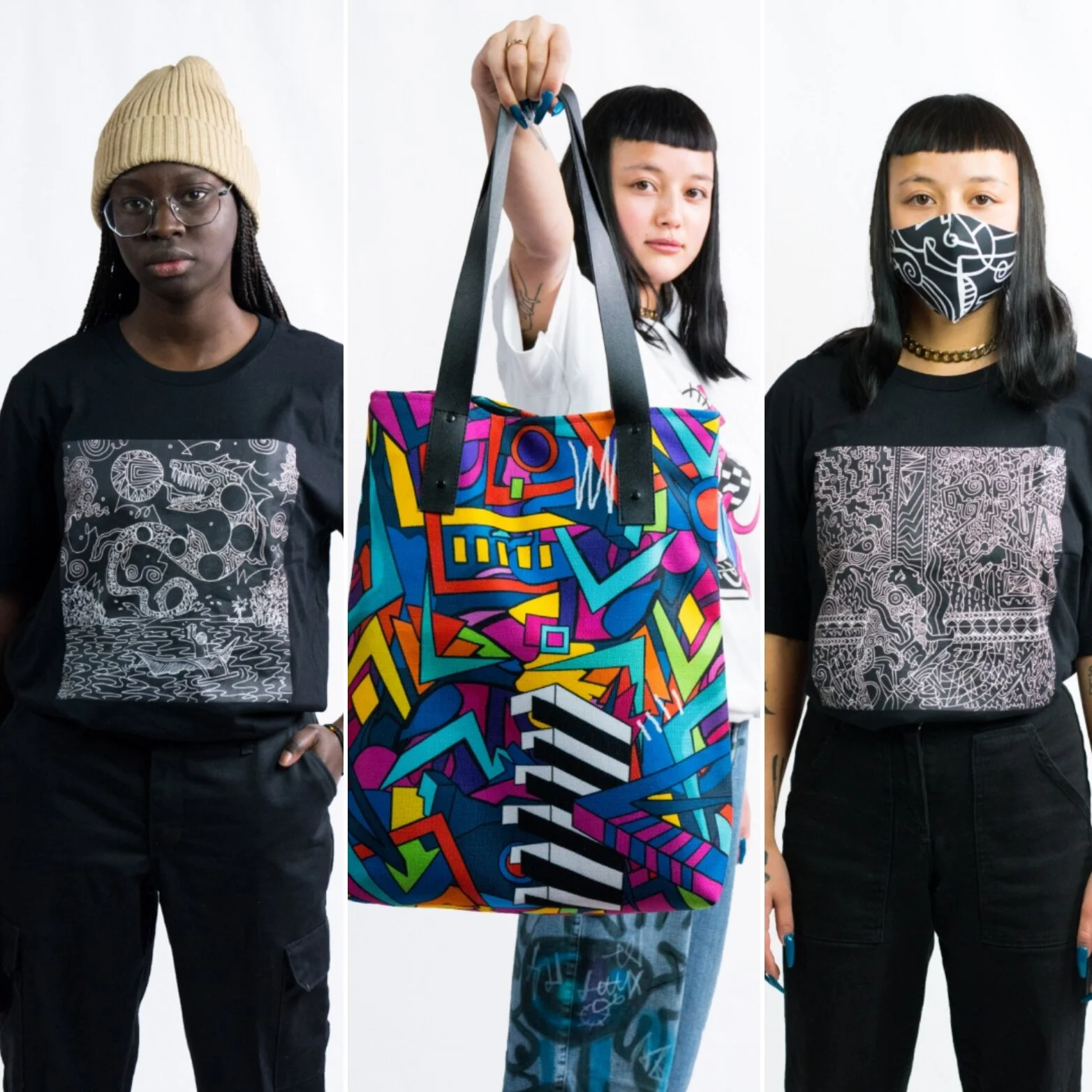 Harvey extends his work on textiles with items people can use on a day-to-day basis, such as totes, shirts, and masks.